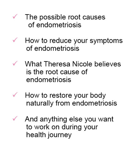 5 Personalized Private Health Coaching Sessions with Theresa Nicole custom-made to your own endometriosis symptoms and health goals where you have the opportunity to learn…